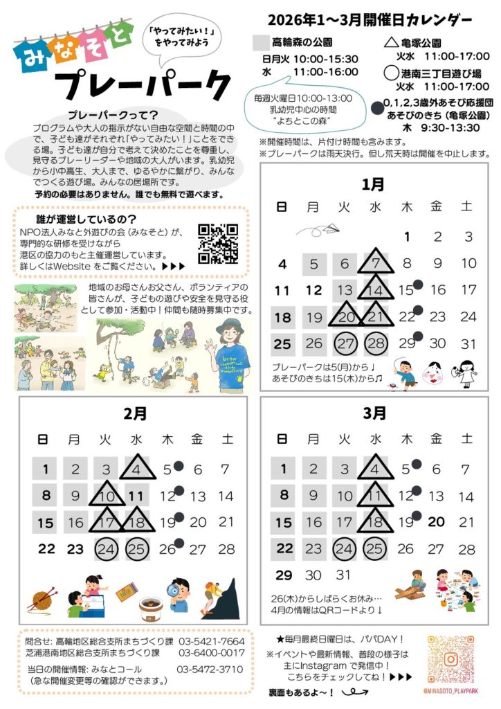 ・新年のみなそとプレーパークは1/5 (月) から、あそびのきちは1/15 (木) から始まります